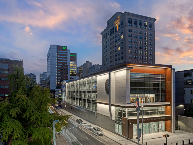 Located at 500 N. Calvert Street in Baltimore, the Shillman Office Building (circa 1972) was purchased by the State of Maryland in 1993 and has housed various State agencies over the last several decades. The project consisted of a complete demolition of the floor plates and the exterior masonry skin. The new exterior is clad in a combination of curtainwall, ground face masonry, sintered ceramic panels, and insulated composite aluminum panels to provide an image of justice and equality under the law while improving energy performance. The USBGC LEED Silver design incorporates high-efficiency HVAC equipment, LED lighting, water-saving plumbing fixtures, and a vegetated roof to reduce the impact of stormwater.